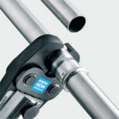 Efectuarea conexiunii este extrem de ușoară. Odată ce conducta debavurată a fost introdusă în fiting până la poziția de stop, canelura fălcii de presare este plasată pe conturul specificat și operația de presare efectuată - rezultă o fixare permanentă prin presare. Riscul unei erori în timpul operației de presare este practic zero.