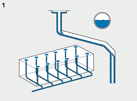 În timp ce sistemele tradiționale permit apei de ploaie să curgă pur și simplu prin conductele în pantă, sistemul compact de conducte Geberit Pluvia se umple rapid și aspiră apa de ploaie de pe acoperiș prin intermediul presiunii negative rezultante. Receptorii de terasă Geberit Pluvia previn aspirația aerului și asigură o performanță fiabilă. Rezultatul: un volum dublu de apa de ploaie este evacuat la jumatatea diametrului conductei.