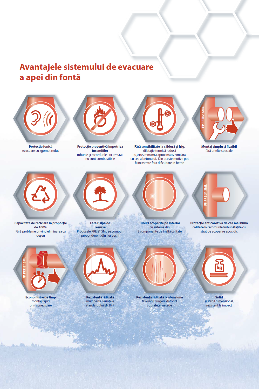 Incepand cu 1982 sistemul SML – fara mufare a inlocuit in totalitate teava de scurgere cu mufa. Materialul de calitate superioara a tevilor, racordurile usor de manuit si imbinarile fiabile formeaza o retea de conducte functionala si durabila cu economisirea de spatiu, care corespunde cerintelor locative de inalta calitate si dotari tehnice moderne ale cladirilor. Totodata indeplineste conditiile principale de Securitate: protectia fonica, protectia impotriva incendiilor. Tuburile si racordurile SML sunt acoperite cu un strat de rasini epoxidice de inalta calitate, de culoare brun-roscat atat pe interior cat si pe exterior.